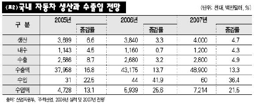 산자부는 올해 국내 자동차 생산이 내수시장 회복과 수출증가에 힘입어 최초로 400만대를 돌파할 것으로 내다봤다.<표2 참조> 자동차 내수의 경우 신차 출시와 보유차량 차령증가로 인한 잠재수요를 고려해 4.3% 증가할 것으로 전망했다. 수출에서는 4.9%의 증가율을 예상했는데, 해외수요 증가추세에다 국산차의 품질·브랜드 가치 상승, 수출단가 상승요인을 반영한 것이다.