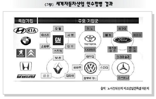 제너럴모터스(GM)가 오펠·사브·이스즈·스즈키·스바루·대우, 포드가 재규어·볼보·마쯔다·애스턴마틴·랜드로버를 인수했다. 다임러크라이슬러는 다시 미쓰비시와 합병했다. 폭스바겐(VW)은 아우디·세아트·스코다·람보르기니, 도요타자동차는 히노와 다이하츠, 르노는 닛산·다치아·삼성을 각각 인수했다. 결과적으로 세계 자동차산업은 GM, 도요타, 포드, 르노·닛산, 폭스바겐, DCX 등 6대 메이저 자동차그룹으로 재편됐다.<그림1 참조>