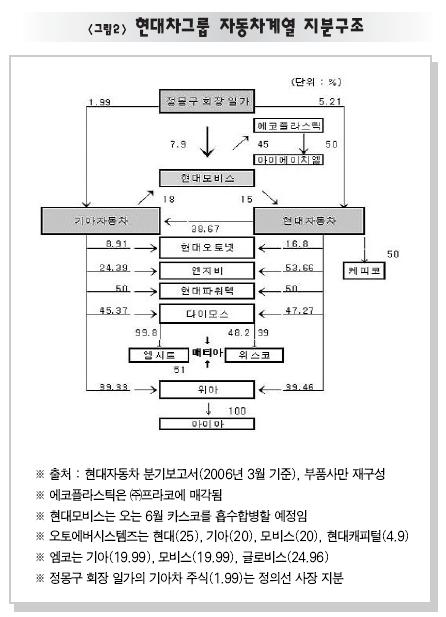 현대차그룹은 사실상 지주회사인 현대모비스를 중심으로 한 순환 출자구조를 가지고 있다. ‘현대모비스→현대자동차→기아자동차→현대모비스’로 이어지는 지분구조를 보인다. 정몽구 현대차그룹 회장일가가 현대모비스의 일부지분을 가지고 현대차와 기아차는 물론이고 현대오토넷·다이모스·위아 등 부품계열사까지 장악하고 있다. 현대차그룹은 모듈(현대모비스·위아), 내비게이션과 전장부품(현대오토넷), 변속기(다이모스)와 같은 핵심 부품업체를 지분구조로 얽어 ‘부품 수직계열화’ 체제를 갖춰나가고 있다.