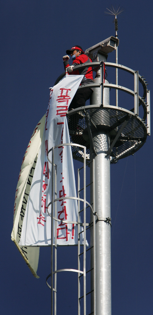 책상 밑을 기어 다니며 일하던 40대 비정규 노동자가 25미터 높이의 철탑에 올랐다. 9일 코스콤 비정규지부 조합원 한명이 전날 벌어진 경찰의 폭력적인 연행을 규탄하며 원효대교 남단 교통관제탑에 올라 고공농성을 벌였다. 그는 식사반입도 거부한 채 연행된 조합원들이 석방될 때까지 농성을 이어갈 것이라고 밝혔다. 현재 사무금융연맹 간부를 포함해 74명의 조합원들이 영등포 경찰서를 비롯해 8개 서에 구금돼 있다. <사진·글=정기훈 기자> <매일노동뉴스> 2007년 10월 10일