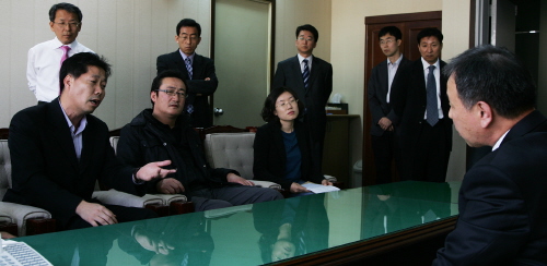 24일 오전 정용건 사무금융연맹 위원장을 비롯한 연맹 임원진과 코스콤 비정규지부 조합원들이 서울 공덕동에 위치한 중앙노동위원회를 찾아 이원보 중앙노동위원장과 면담을 하고 있다. 이들은 코스콤 문제가 중차대한 사안임을 강조하며 중노위의 책임 있는 역할을 주문했다. 또한 노동부의 불법파견 판정과 지난 22일 국정감사에서의 지적사항을 감안해 다시 조정신청을 올릴 것이라 밝혔다. 이원보 위원장은 코스콤 문제에 대해 안타까움을 표시하며 "(법률적)조건이 맞는다면 사후조정 등을 검토하겠다"고 말했다.(위 사진)