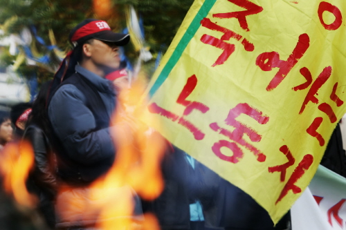새삼스럽지 않다. 죽었거나 죽어가는 노동자가 줄을 잇는다. 교섭하고 단체협약을 맺자는 '배부른 요구'는 받아들여지지 않았고 제 몸에 불을 놓아서야 기껏 뉴스 한 꼭지 채울 뿐이다. 전태일의 '인간선언' 이후 37년, 지금 노동자들은 기계도 채 못 되는 '소모품'이 되어 여전히 길바닥에서 망루에서 관제탑에서 노동법을 뒤적인다. 찬바람이 드세던 1일 여의도 증권거래소 앞에 장작불이 타올랐다. 그 너머로 코스콤 비정규직 노동자가 만장(輓章)을 들었다