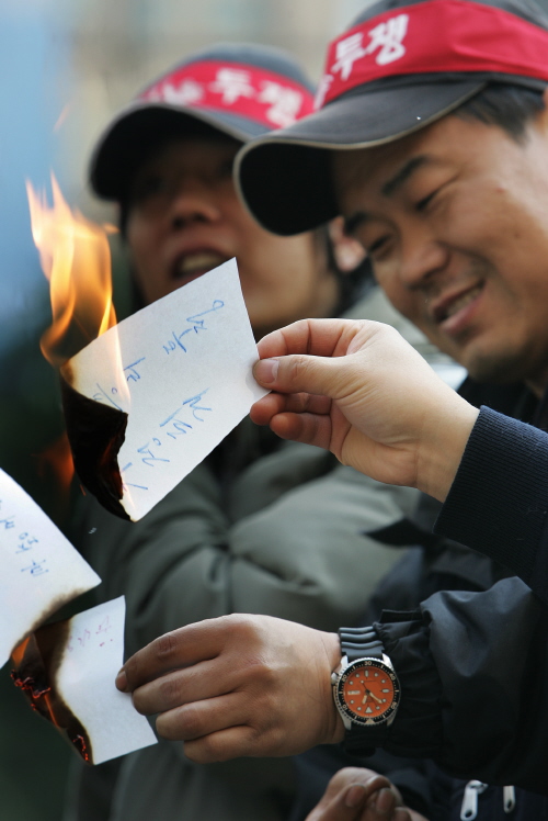 재밌는 소원 좀 쓰라는 상쇠의 당부가 무색하게 코스콤 비정규 노동자들이 적어낸 소원지엔 '단결·투쟁·승리'만 가득하다. 불기운 머금은 바람이 신명나는 비나리 장단을 타고 7미터 단식농성 망루를 넘어 하늘로 날아간다. 속이라도 후련할까. 한뎃잠 58일째를 맞는 조합원의 미소가 반갑다. 8일 증권거래소 앞 '비정규직 통곡의거리'에서 굿거리 장단이 반가웠다. <매일노동뉴스> 2007년 11월 9일