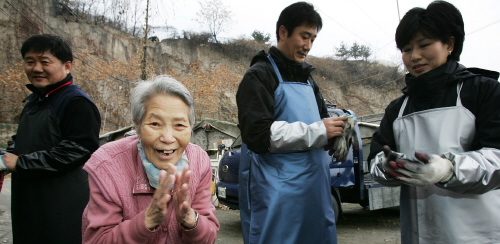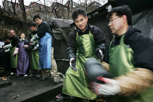 사고라도 날까 싶어 조심조심 건네더니 어느덧 익숙하게 던지고 받는다. 시린 겨울 달래줄 연탄이 손에 손을 타고 창신동 가파른 언덕길을 힘차게도 오른다. 연탄 한 장의 무게는 3.6kg. 대선 후보 누구는 두어 장을 나르고 사라졌다지만 1천300장을 직접 나른다. 땀이 좀 나고 팔이 떨려올 뿐, 마음은 뿌듯하다. 20년째 쪽방 살이를 해 온 김진순(85) 할머니 얼굴엔 웃음꽃이 활짝이다. 11일 금융노조 김동만 위원장을 비롯한 본조 간부 30명이 종로구에 500만 원의 이웃돕기 성금을 전달하고 직접 연탄 배달에 나선 현장이다.
