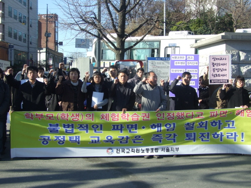 이어 전국교직원노조의 기자회견이 시작됐다. 기자회견이 한참 진행되고 있을 때 초등학생이 천진난만한 모습으로 기자회견장 앞을 지나쳤다. ‘불법적인 파면·해임 철회하고 공정택 교육감은 즉각 퇴진하라’는 현수막을 들고 앞자리에 서 있던 한 선생님은 기자회견문을 읽는 것도 잊고 아이가 골목을 돌아 나갈 때까지 바라보았다.