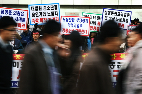 7일 정오 여의도 한나라당사 앞에서 현대미포조선 굴뚝 농성사태 해결을 촉구하며 민주노총이 연 기자회견. 점심시간을 맞은 직장인들이 그 앞을 지나가고 있다. 울산에서 올라온 김원곤(51)씨 등은 현대미포조선의 대주주인 정몽준 한나라당 의원이 직접 나서 해결해야 한다고 말했다. 굴뚝농성은 이날로 15일째. 음식물 반입까지 막는 회사측의 태도에 기어코 서울로 올라와 목청을 높였다. 지난해 7월 대법원은 “현대미포조선과 용인기업 직원들 사이에 묵시적 근로계약 관계가 성립됐다고 보인다"고 판결했다. 김씨는 6년째 복직투쟁을 하고 있다.