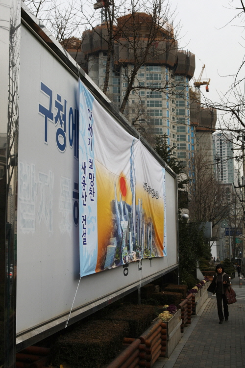 20일 서울 용산구 백범로 용산구청사 앞 대형 옥외 게시판에 걸린 현수막에 "새해 복 많이 받으세요", "희망한 새용산 건설" 등의 문구가 적혀 있다. 현수막을 들추니 이렇다. "구청에 와서 생때거리를 쓰는 사람은 민주시민 대우를 받지 못하오니 제발 자제하여 주시기 바랍니다." 재개발 사업으로 인한 철거민들의 시위가 잇따르자 용산 구청이 내걸었던 대형 선전물이다. 이날 새벽 생존권 보장 등을 요구하며 시위를 벌이던 철거민들에 대한 경찰의 강제 진압 과정에서 발생한 화재로 5명의 주민이 목숨을 잃었다. 게시판 너머론 고층 빌딩 공사가 한창이다.