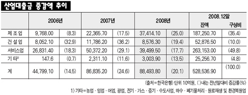 건설업 대출금은 지난해 8조6천억원이 증가해 2007년의 11조8천억원보다 16.6% 감소했다. 서비스업 대출금도 지난해 39조5천억원이 늘어나 50조4천억원 증가했던 2007년에 비해 증가 폭이 둔화됐다.