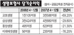 생보업계 관계자는 "생보사의 가장 큰 자산비중을 차지하는 채권이익이 지난해 고금리로 크게 준 측면이 가장 결정적인 원인"이라며 "제조업의 매출과 같은 수입보험료(계속보험료+신규보험료 등)도 금융위기 여파로 크게 줄었기 때문"이라고 말했다.