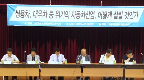 자동차산업 전문가와 국회의원들은 4일 서울 여의도 국회도서관에서 열린 '위기의 자동차산업 회생을 위한 토론회'에서 정부가 GM대우차와 쌍용차를 하나의 회사로 재출범시켜 고용안정·미래경쟁력을 확보해야 한다고 주장했다.