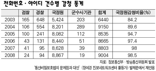 법무부가 제공한 2001년부터 2006년 사이 죄명별 감청현황 통계에 다르면 살인죄(603회)·절도·강도(434회)·마약(48회)·성폭력범죄(27회)·미성년자 약취·유인(18회)보다 국가보안법위반(1천23회)의 경우가 월등히 많다. 국가보안법 위반은 국정원이 수사권을 갖고 있는 범죄다.