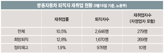 실제 실직자들의 재취업률은 아주 낮다. 노동부에 따르면 창원공장까지 포함해 쌍용자동차 퇴직자 2천646명 중 18일 현재 재취업에 성공한 사람은 10.5%에 불과한 279명이다. 그것도 자영업자를 포함한 것이다.<표참조>
