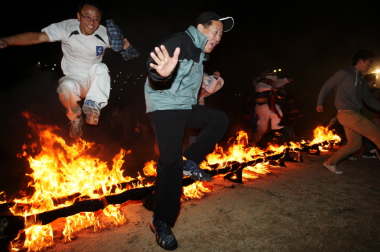 넘으라고 올린 불길이라 어영차 넘어 보자. 이리 고된 몸, 저리 아프던 맘일랑 저편 땅에 내려두고 자진모리 덩따궁따~ 장단에 몸을 실어, 날려라 못된 액운 저 불길에. 얼씨구 소리치메 막힌 속도 확 뚤리니 저 불길이 불로장생 보약이라. 신명풀이 굿판엔 신종플루 디딜 곳도 미처 없더라. 기원하니 굿판이라 색동한지 소원지가 새끼줄에 촘촘하여 달집이 알록달록. 불이 번쩍 타오르니 달집이 타닥탁탁 하늘길이 환히 열린다. 비우니 비로소 굿판이라 너나없이 시름 비워 다만 손 맞잡아 돌고 돌아 아빠는 강강수월래 아이는 강강설래. 굿판이라 해방세상, 살림해방 아빠 뒤로 공부해방 아이 뒤로 육아해방 엄마 옆에 막걸리 얼큰히 취한 주당 삼촌. 또 뒤엔 손잡아 설레는 처녀 총각이 웃음꽃 헤벌레. 덩덩 쿵덕쿵~ 휘모리 장단 끝내 휘몰아치니. 넘어라 불길일랑, 열어라 대동굿판, 외쳐라 해방세상. 얼씨구나 좋단다. 지난 24일 서울에서 열린 풍물패 '터울림'의 가을굿 '어영차 청청 해방세상 들래'중 불사다리 넘기 모습.