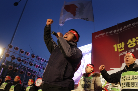 잘라 낼 머리칼도 얼마 없는 사람이 많았다. '바리깡'질 두어 번, 처삼촌 묘 벌초하듯 대충 밀고 당기면 깨끗했다. 늙은 노동자 머리숱이 워낙에 적었던 데다 원형 탈모 빈자리가 너른 탓이었다. 어느 한순간 순탄치 않았던 오랜 노조 활동의 흔적이다. 긴 머리칼에 미련 없던 사람도 여럿이었다. 나순자 보건의료노조 위원장은 예의 그 비장한 표정 한번 없이 가만히 눈을 감았다. 잠시 눈을 떠 바라본 건 그 앞에 날리던 노란 깃발이며 그 아래서 꿈쩍 않던 조합원들이었을 테다. 사람 여럿이 불에 타 죽어도 꿈쩍 않는 비정한 시대가 부끄러웠던지 임성규 민주노총 위원장은 삭발 소식을 기자들에게 알리지도 않았다. 채 자라지 못한 머리칼이 다시 여의도 칼바람에 흩날렸다. ‘시너를 끼얹고 싶은 심정’만을 마이크 잡아 널리 알렸다. 삭발 한번 한다고 달라질 게 뭐냐며 되물었던 신 사무총장이 앞서 구호를 외치는데 그 표정이 남다르다. 결기 서린 선창에 메아리가 우렁차니 삭발의 의미가 비로소 선명했다. 깎은 머리 머쓱해지지 않도록 잘 벼를 일이 남았는데, 그날 밤 여의도 문화마당을 뒤덮은 천막이 체온으로 더웠으니 깎은 머리 으쓱해 힘을 낼 만하다.