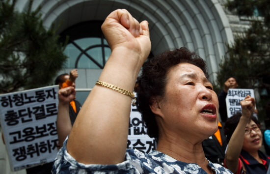 할머니 팔뚝이 그냥 굵었나. 쓸고 닦고 지어 많던 모진 일 한평생의 흔적이다. 다 늙어 어머니 이젠 쉬시라는 자식들 만류도 뿌리치고 나선 일터. 빗자루 대걸레 말고 어머니 주먹 들어 외치길 하청노동자 신세 억울함이 참도 컸다고. 동덕여대 본관 앞에서 '비정규직철폐' 구호를 목청껏 내지른다. 최저임금·고용불안, 좁은 쉼터 눈칫밥을 견디며 길게는 10년, 짧아야 3년. '뼈 빠지게' 일했는데 해고란다. 벼룩시장 구인광고를 보고서야 그걸 알았다. 학교는 용역회사 재계약을 비밀로 했다. 용역회사는 대화를 거부했다. 회유와 협박이 다만 오갔다. 고용승계는 불가란다. 계약만료일인 지난달 31일, 어머니 기어코 주먹 쥐고 나선 이유다. 학교 사무처장실을 찾아 항의했다. 총장실은 문이 잠겼다. 자리에 눌러 앉아 농성을 했다. 따뜻한 밥 한 끼 거기서 지어 먹고 어머니 외쳤다. 고용승계 보장하라! 노동조건 개선하라! 노조와 대화하라! 개교 60주년·재단창립 100주년, 학교 사무처가 그 와중에 분주했다.