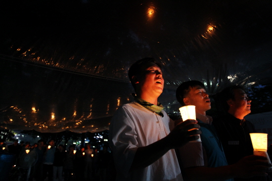 한여름 무성한 나뭇잎에 가려 농성장은 구석졌다. 노숙인 몇몇이 띄엄띄엄 벤치 잡아 모로 누웠을 뿐, 지나는 이가 적었다. '타임오프 철회, 노조탄압 중단' 구호 현수막 어지럽던 미로 한가운데 비닐 천막이 간신히 비를 막았다. 곡기 끊어 앞장선 김영훈 위원장이 자꾸 서진 못해 오래 앉고 누워 그 자릴 밤낮으로 지켰다. 찾아들던 여기저기 누구 저들을 다 맞아 반기니 지칠 법도. 밝은 표정 여전하니 젊음은 역시 보약이던가. 정진후 전교조 위원장이 찾아 주의사항을 꼼꼼히 전한 덕인가. 아니, '결의' 때문이라고 위원장이 말했다. '준비'라고도 했다. 왜냐고 묻는 사람들이 많았던가. 폭염이 가까웠고, 관심은 멀었던 탓이다. 지키자 모여들었던 촛불이 띄엄띄엄. 민주노총 간부 얼굴만 그 빛에 붉었다. 발언도 노래도 잠시, 투쟁 점검회의가 뒤따르니 민주노총 수송동 시대가 열리는가. 비워 채우는 게 단식일 터, 단속은 내부용이다. 구름 짙어 흐렸던 날, 어깨 걸고 촛불 들어 노래하던 농성장 하늘에 그래도 별이 여럿 노랗게 반짝반짝. 정동시대 민주노총, 더 큰 도약 기다려 이렇게 '정중동'일 테지.
