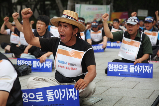 이전 기사보기 다음 기사보기 2025-11-26 [사진기사] 더도 말고 '합의서 이행' 바로가기 복사하기 본문 글씨 줄이기 본문 글씨 키우기 스크롤 이동 상태바 포토뉴스 [사진기사] 더도 말고 '합의서 이행' 화물연대 창원LG분회 여의도 LG본사 앞 규탄집회 기자명 정기훈 기자 입력 2010.08.05 09:31 댓글 0 다른 공유 찾기 바로가기 본문 글씨 키우기 본문 글씨 줄이기 이 기사를 공유합니다 페이스북(으)로 기사보내기 트위터(으)로 기사보내기 카카오스토리(으)로 기사보내기 URL복사(으)로 기사보내기 닫기 화물연대 경남지부 창원LG분회 소속 조합원들이 4일 낮 서울 여의도 LG전자 본사 앞에서 '화물노동자 탄압 LG자본 규탄대회'를 열어 구호를 외치고 있다. 이들은 이어 1박2일 노숙농성에 들어갔다. 창원LG분회는 노조활동 보장과 합의사항 이행을 요구하며 지난 6월21일 LG전자의 물류 자회사인 하이로지스틱스를 상대로 파업에 들어가 이날로 45일째 싸움을 이어가고 있다. 정기훈 기자 photo@labortoday.co.kr 겨울, 농성 저작권자 © 매일노동뉴스 무단전재 및 재배포 금지 SNS 기사보내기 공유 이메일 기사저장 댓글삭제 삭제한 댓글은 다시 복구할 수 없습니다. 그래도 삭제하시겠습니까? 비밀번호 닫기 기사 댓글 0 댓글 접기 댓글입력 권한이 없습니다. 댓글 내용입력 비회원 로그인 이름 비밀번호 댓글 내용입력 댓글쓰기 계정을 선택하시면 로그인·계정인증을 통해 댓글을 남기실 수 있습니다. 회원 로그인 이름 비밀번호 자동등록방지 로그인 옵션 창닫기