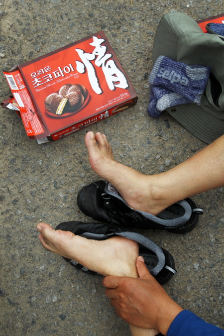 십 리도 못 가 발병 나니 그 너머 재는 똑 아리랑 고개렸다. 나를 버리고 가는 길, 천리길도 넘어 700여킬로미터 대장정. 한뎃잠 마다 않고 걷고 또 걸어 이 마을 저 동네 발길 닿지 않은 곳이 이제 남한 땅엔 적었다. 다 늙어 사서 고생이니 별난 사연 기구할 터, 이름부터 별나 특수고용노동자라고. 아니, 매인 곳 없이 떠돌아 하루 끼니 위태하니 그 옛날 걸립패던가. 말하지 않아도 동네 사람들이 다 알고 나와 초코파이 건네니 그 뜻을 말하지 않아도 정(?)은 두루 통했다. 곤한 몸 부려 잠시 앉은 돌바닥에서 더 없는 위안을 얻었다. 다시 걸을 힘을 그렇게 걸립했다. 물집도 한때,이제는 군살 올라 딱딱한 발도 잠깐 달랬다. 작두라도 탈 지경. 그 발을 견뎌 그저 말없이 또 쉼없이 걸어 서울을 향했다. 흙먼지 모두 마시면서 걸어 천리 길, 굽이 굽이쳐 나아가니 그 뜻을 굳이 말하지 않아도 알 사람은 다 알겠더라. 광고 아니라도 많이들 안다더라.